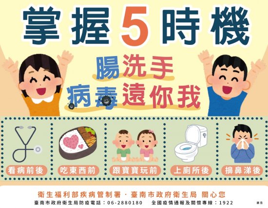 (二)掌握 5 時機,勤洗手遠離病毒! 腸病毒、流感等病毒經由手部傳播,正確洗手是最有效的預防方式!請記住 5 大關鍵時刻用肥皂搓洗雙手至少 20 秒,讓細菌病毒無處可藏!守護自己與家人的健康,從洗手做起!