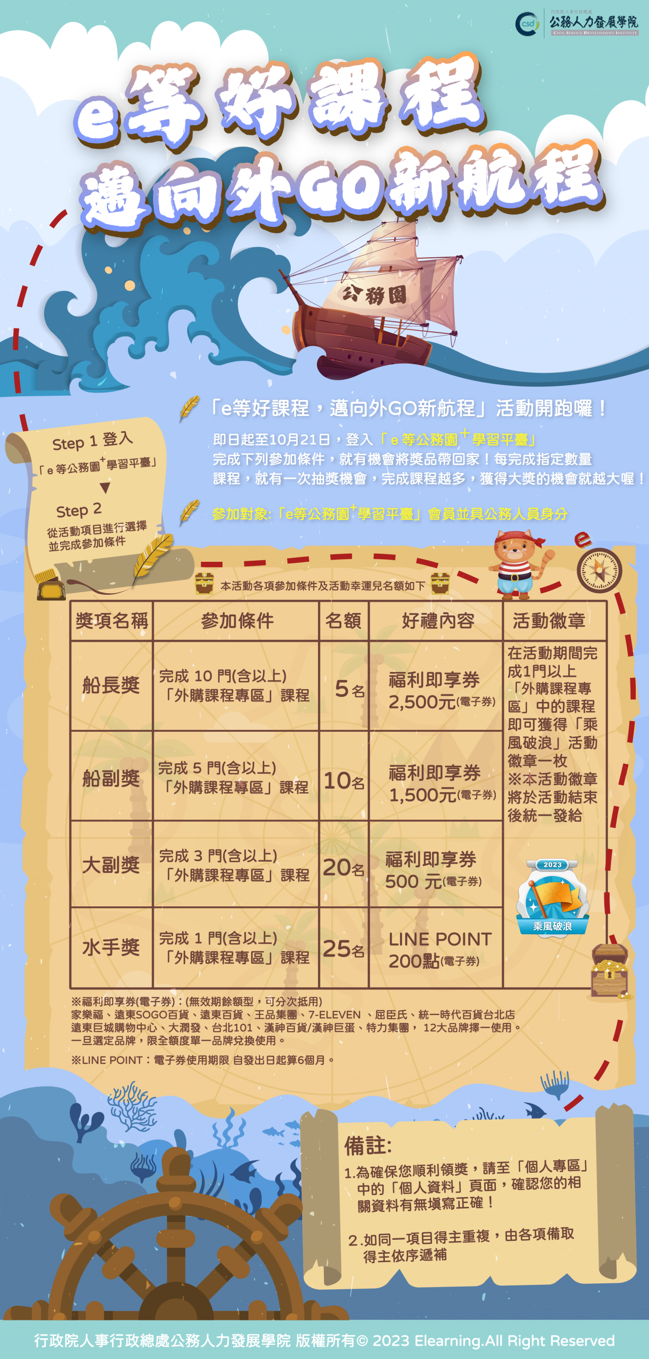 三、人力學院特辦理「 e 等好課程,邁向外 GO 新航程 」線上抽獎活動,凡於本( 112 )年 10 月 21 日前至「e 等公務園+學習平臺」選讀完成任 1 門「外購課程專區」課程,即可參加抽獎(活動內容詳如附件 2 )。