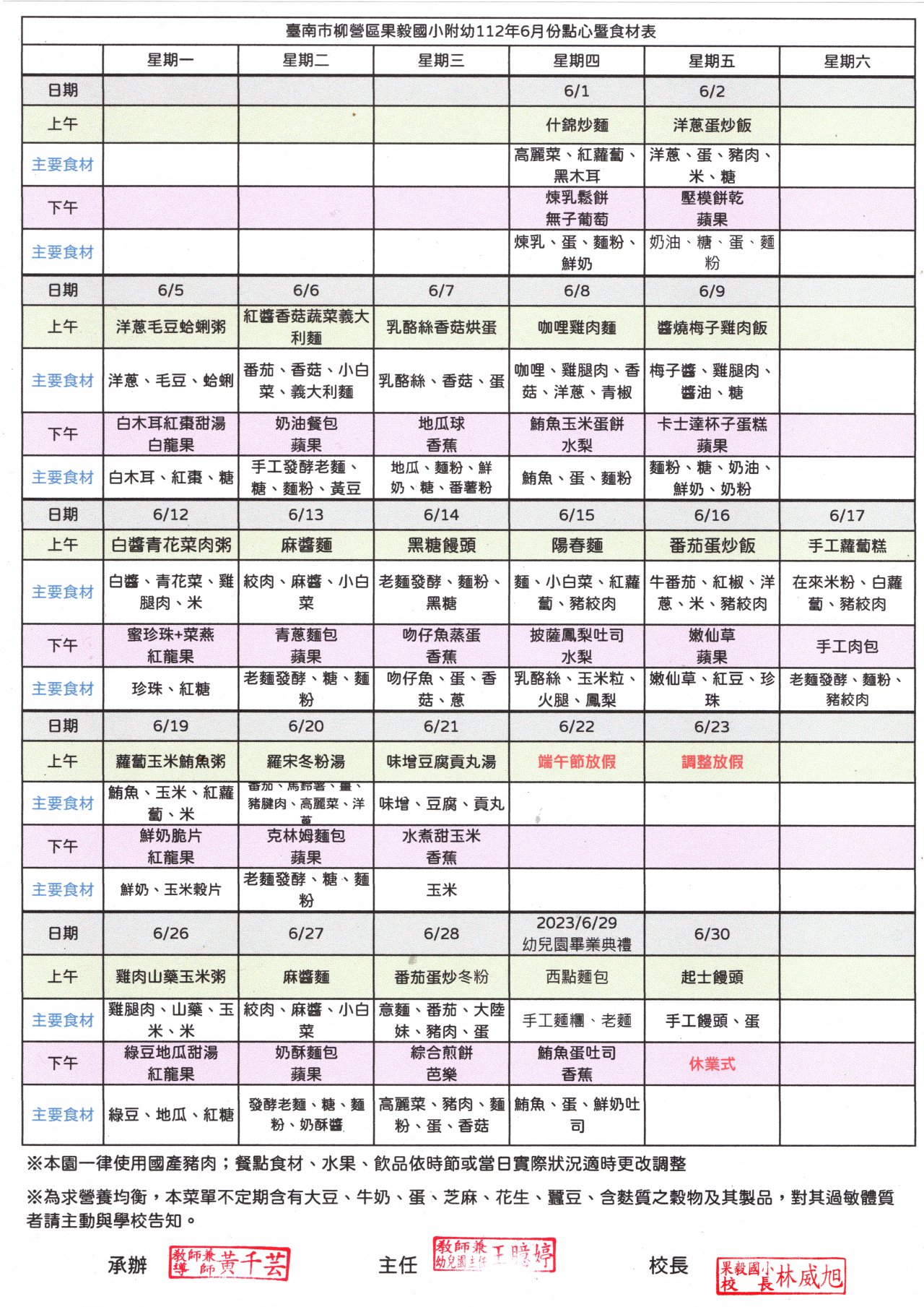 ※本園一律使用國產豬肉;餐點食材、水果、飲品依時節或當日實際狀況適時更改調整
