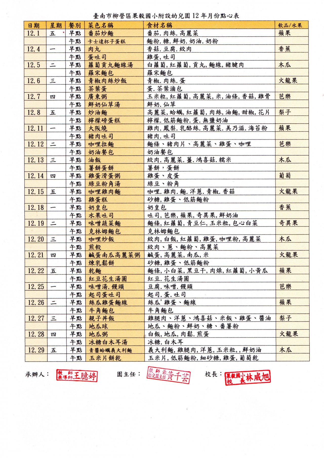 112 學年度第一學期 12 月點心表,如附件。