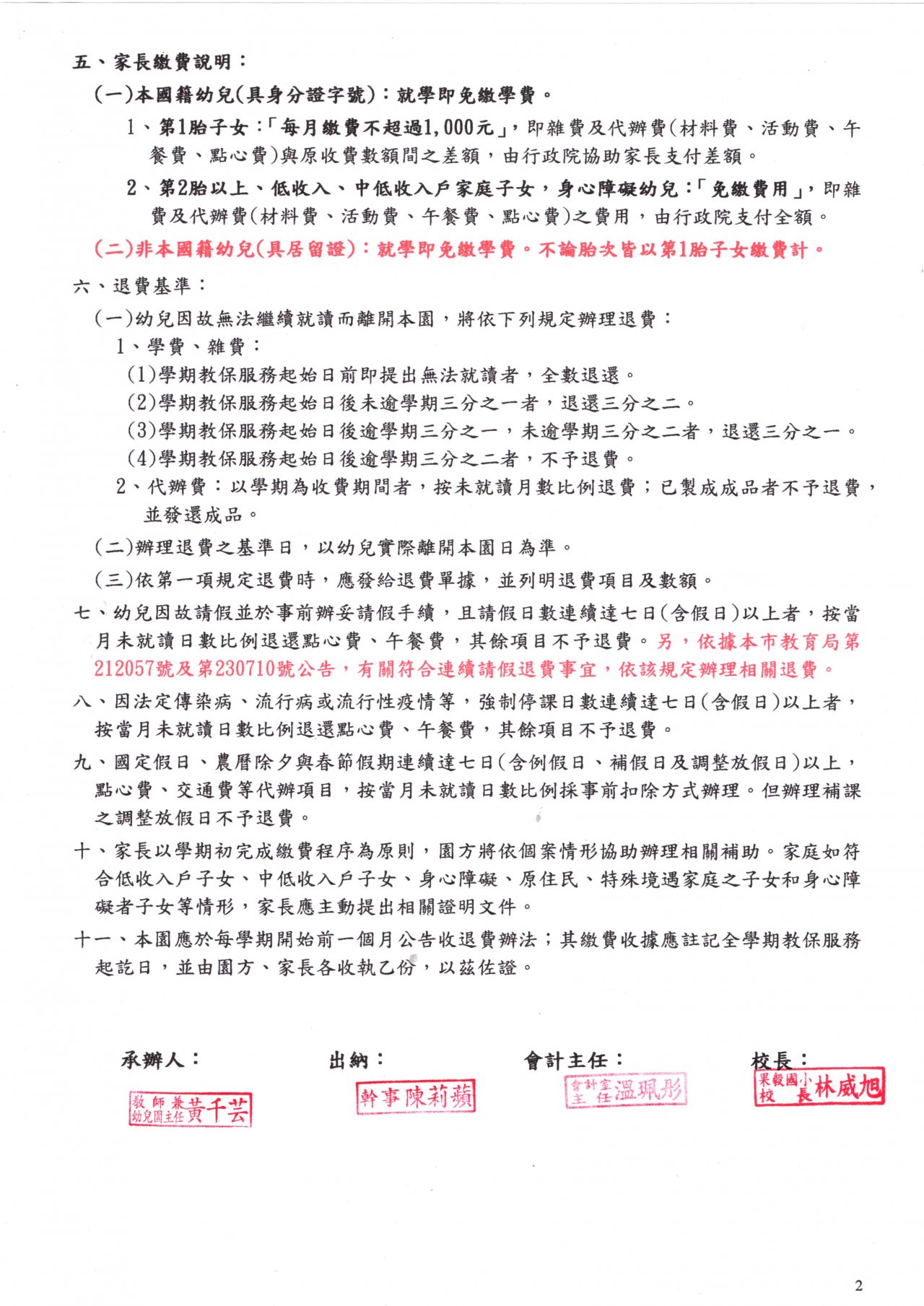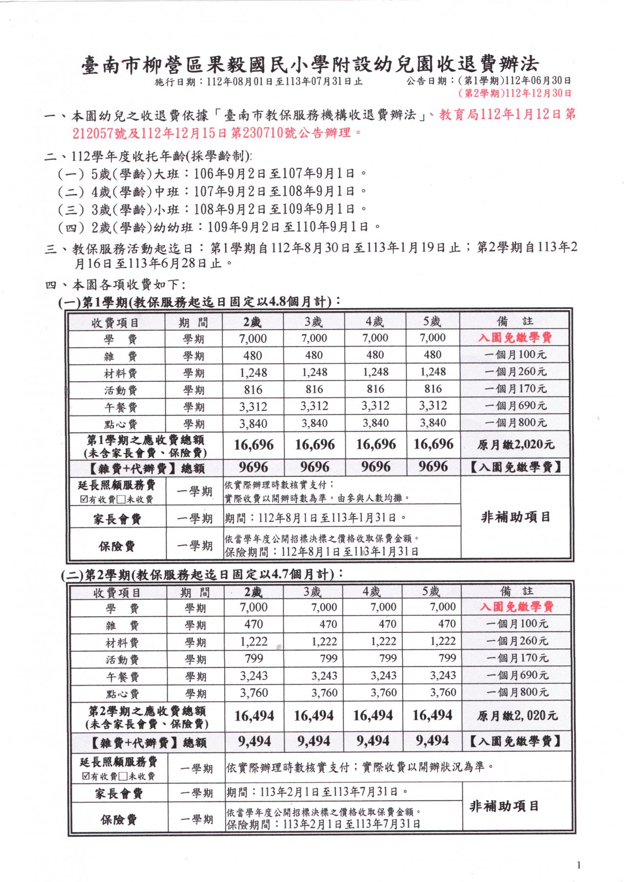 112 學年度第 2 學期果毅附幼收退費辦法如附檔,請參閱。