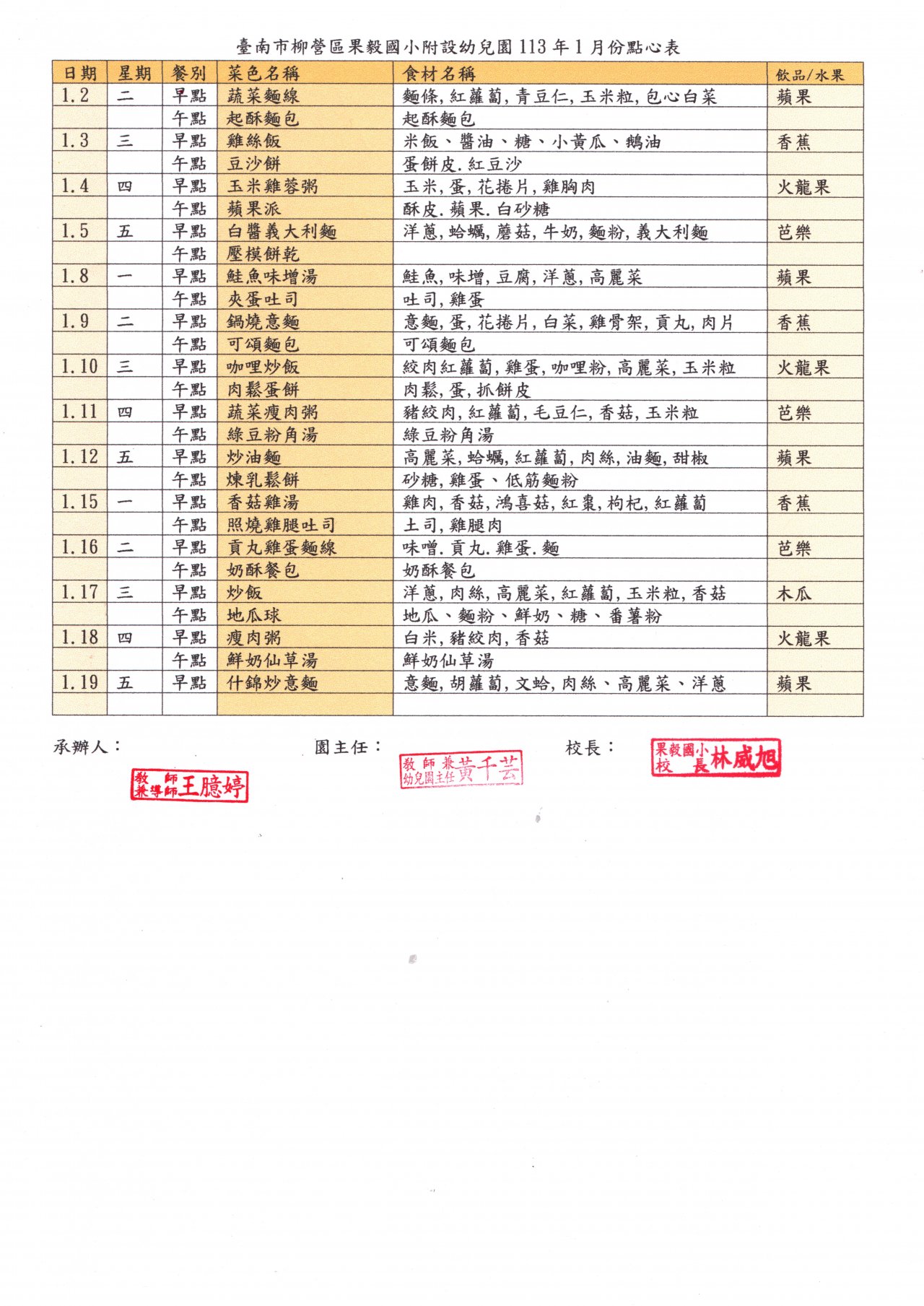 公告果毅國小附設幼兒園 112 學年度第一學期 1 月份點心表,如附件。