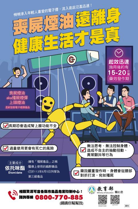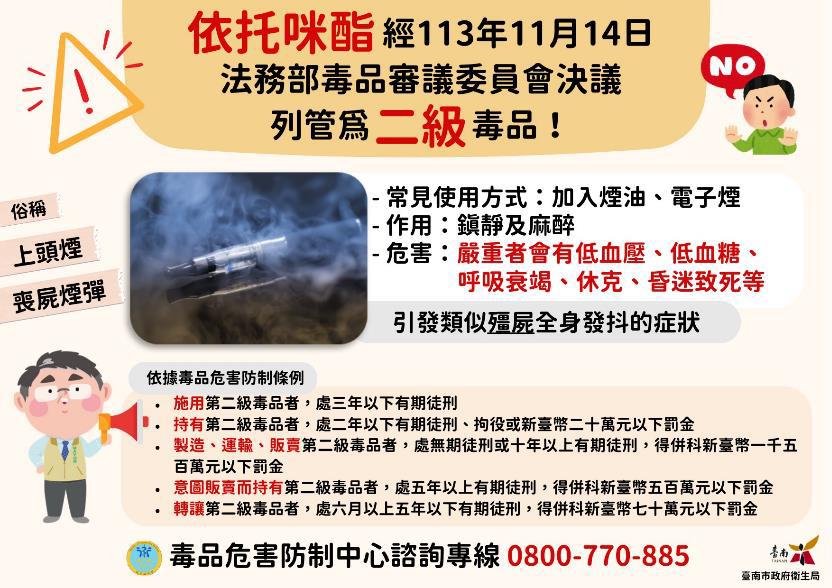 近期警方查緝新興毒菸品的毒情分析,發現含有麻醉鎮靜劑的「依托咪酯」類(俗稱上頭、喪屍菸彈)有濫用情形,不肖業者將依托咪酯添加到電子煙油中,在夜店或社群媒體上向年輕族群兜售,行政院已於 113 年 11 月 27 日公告依托咪酯類列為二級毒品列管,請各校加強宣導,以防止該毒品危害校園。