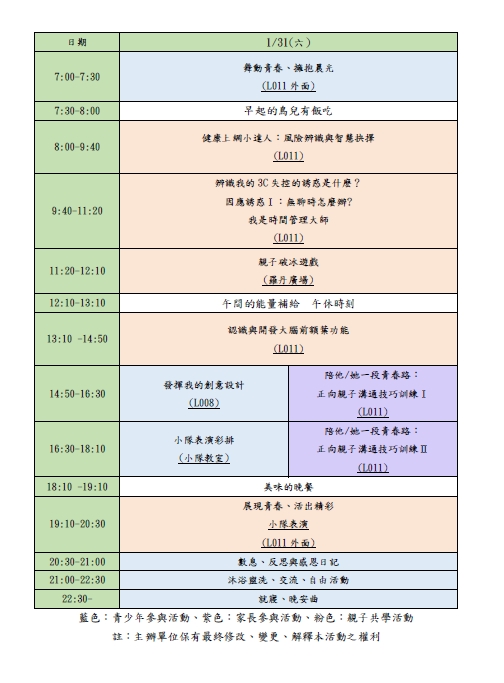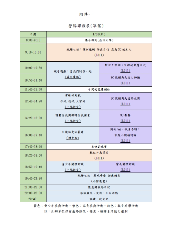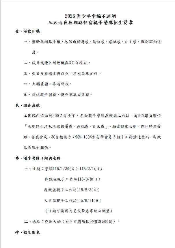 孩子一滑就停不下來?親子對話越來越少?現在就是改變的好機會!本校中亞聯大網路成癮防治中心辦理「2026 青少年幸福不迷網」無網路住宿親子營隊,透過三天兩夜關機體驗、親子共學與趣味活動,培養青少年 3C 自控力,找回親子幸福連線。活動於 115/1/30–2/1 在亞洲大學舉行,並搭配 3 次一日關機親子工作坊。即日起至 115/1/22 下午 5 時止,名額有限,歡迎親子一起報名參加!