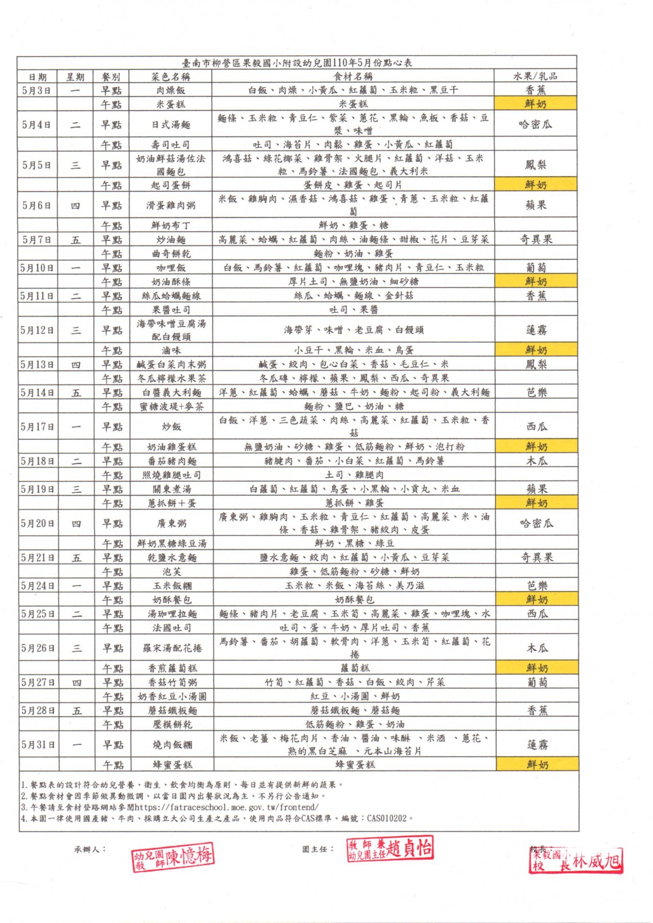 3.午餐請至食材登路網站參閱 https://fatraceschool.moe.gov.tw/frontend/ 4.本園一律使用國產豬、牛肉、採購立大公司生產之產品、使用肉品符合 CAS 標準、編號: CAS010202 。
