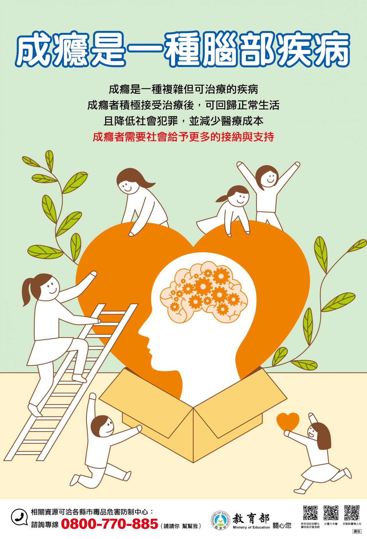 為推動「新世代反毒策略行動綱領 2.0」,解決毒品犯再犯問題,成癮者需要會給予更多的接納與支持,以有效降低再犯;,教育部製作海報 1 款「成癮是一種腦部疾病」供民眾了解訊息。