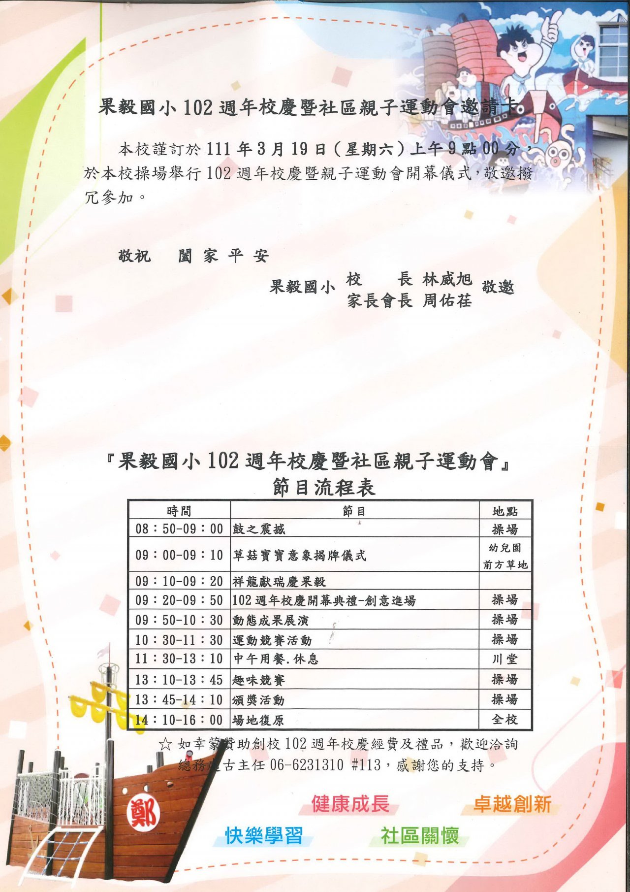 本校訂於 111 年 3 月 19 日(星期六)上午 8:30 ,辦理校慶運動會,邀請各位社區人士及家長們參加果毅國小校慶暨親子運動會,您的蒞臨是學生們進步最大的動力,歡迎撥冗出席。