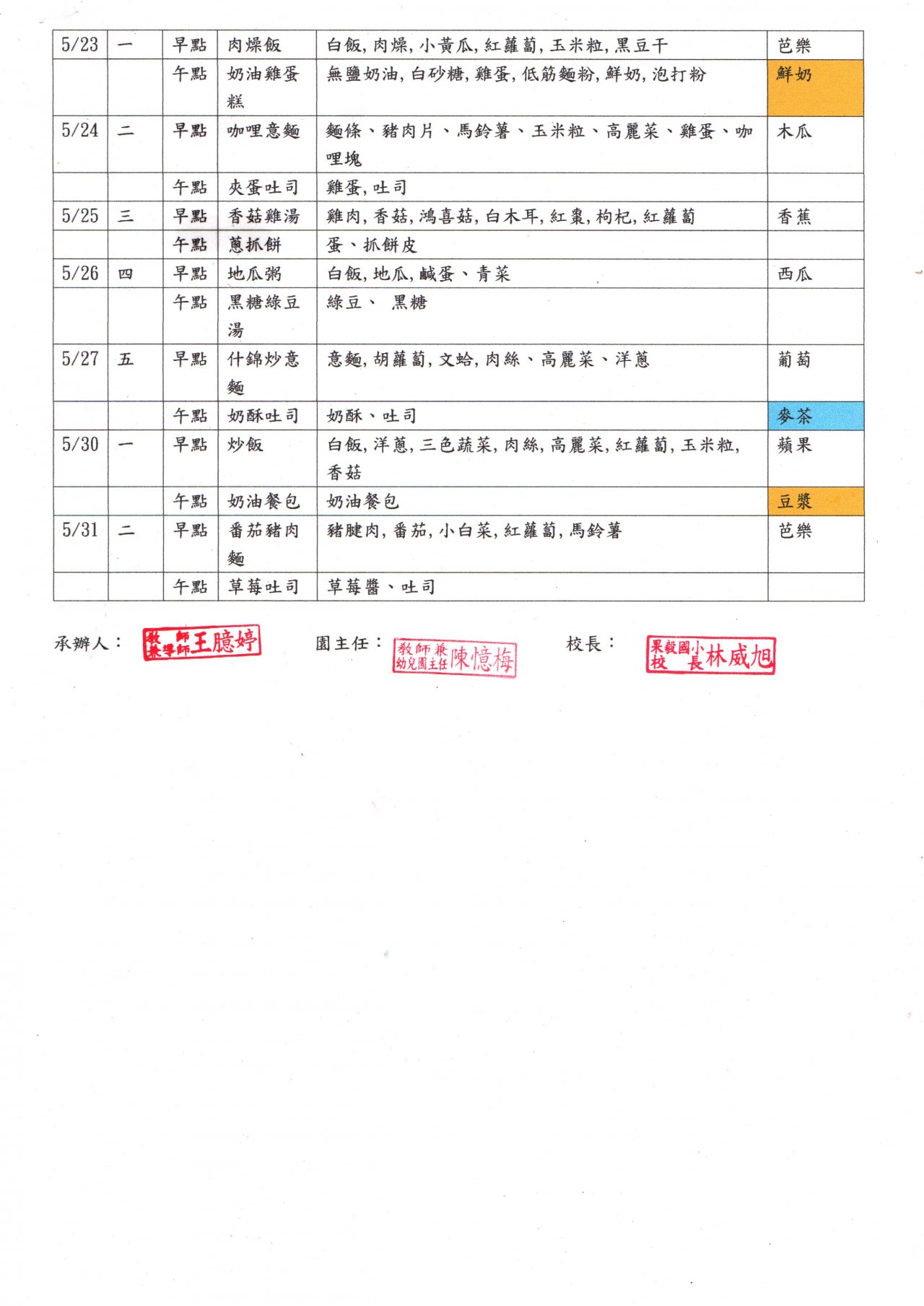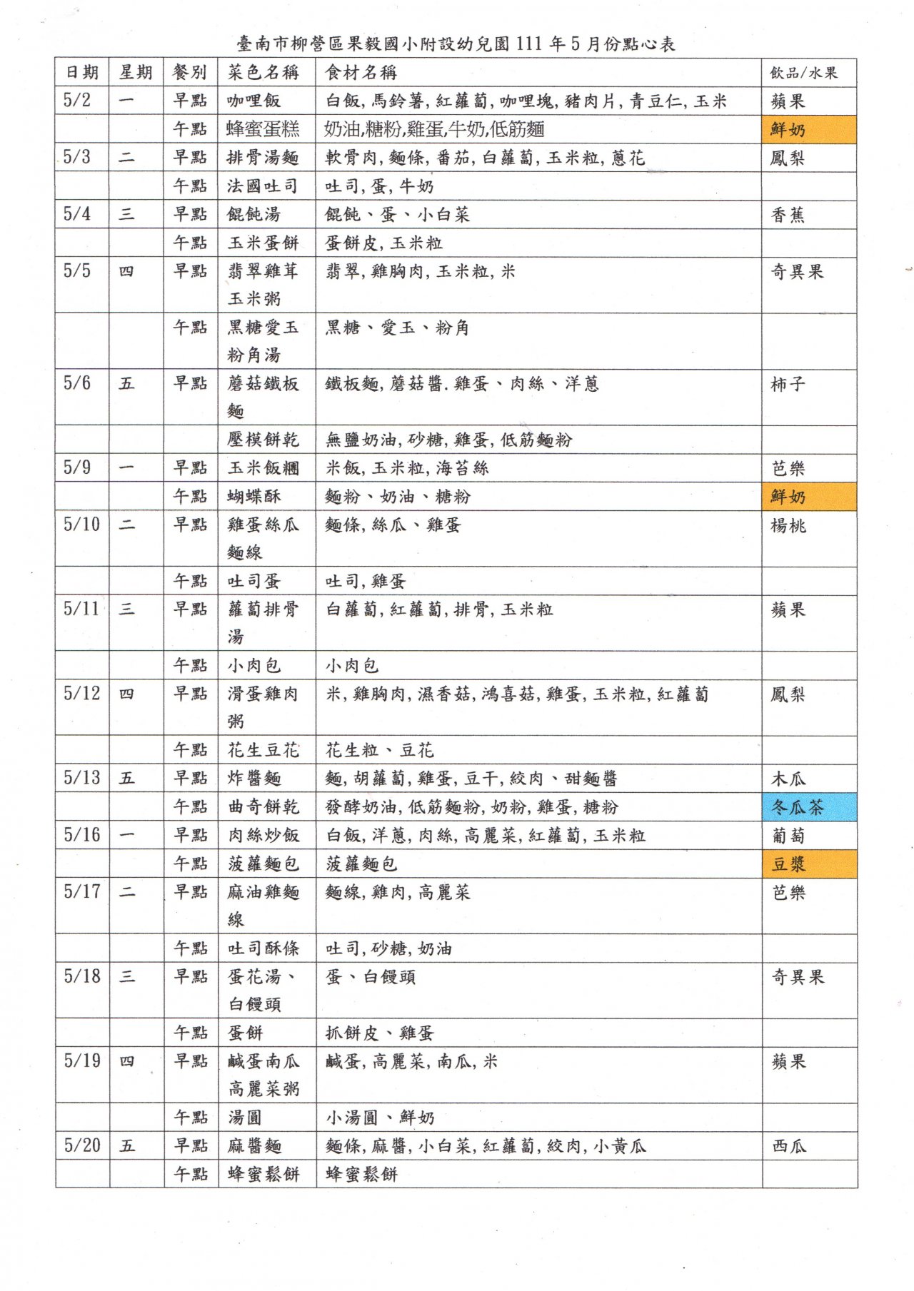 110 學年度幼兒園第二學期 5 月份點心表,如附件。
