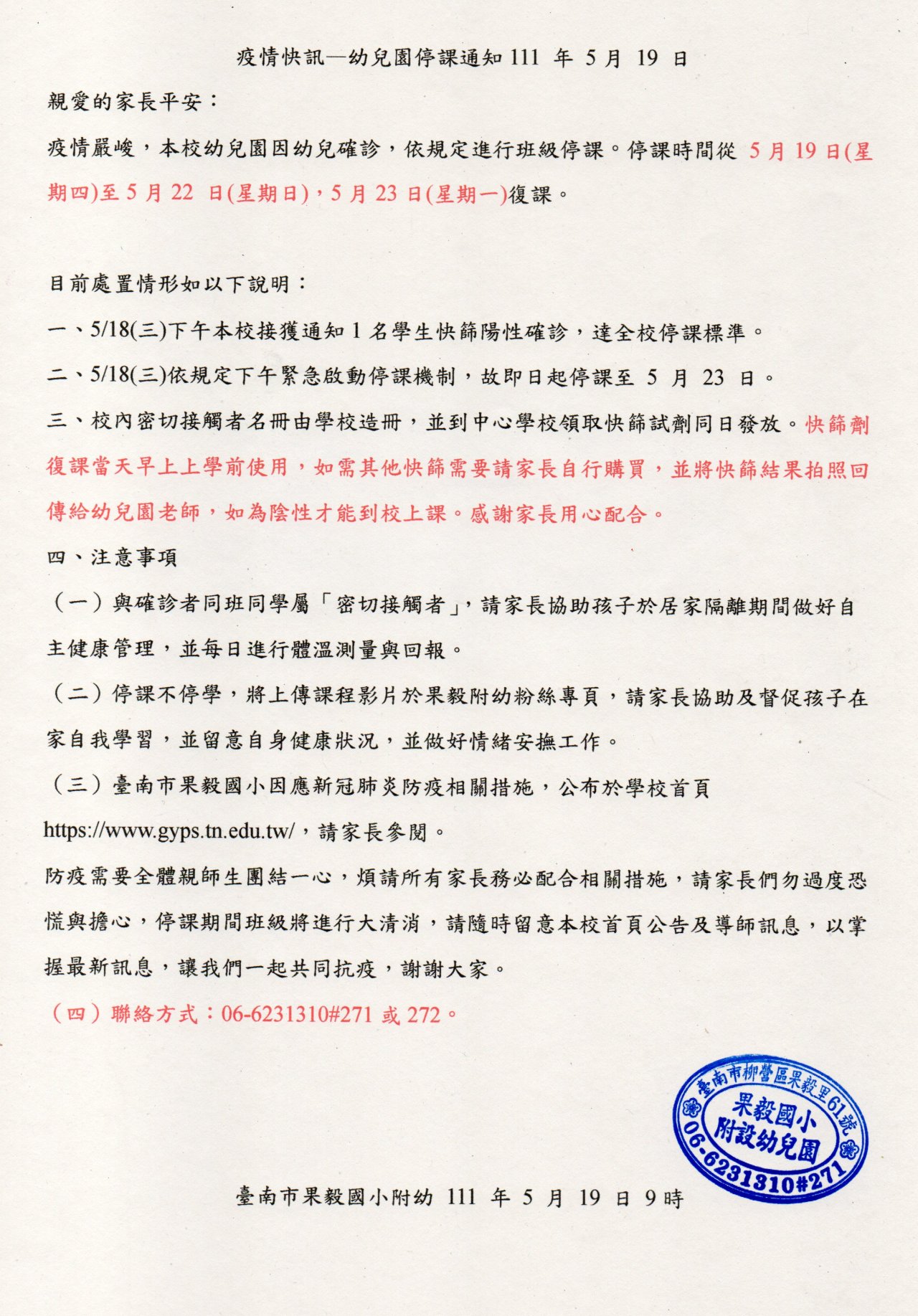 疫情快訊—幼兒園停課通知111 年 5月 19 日
