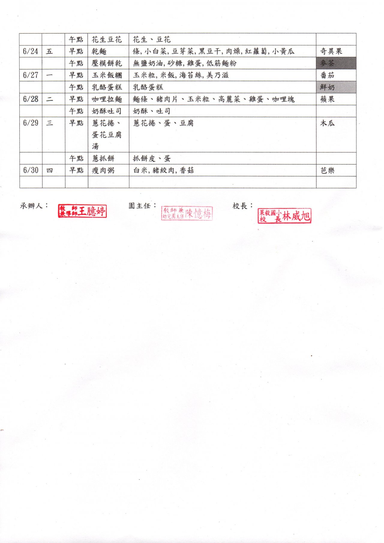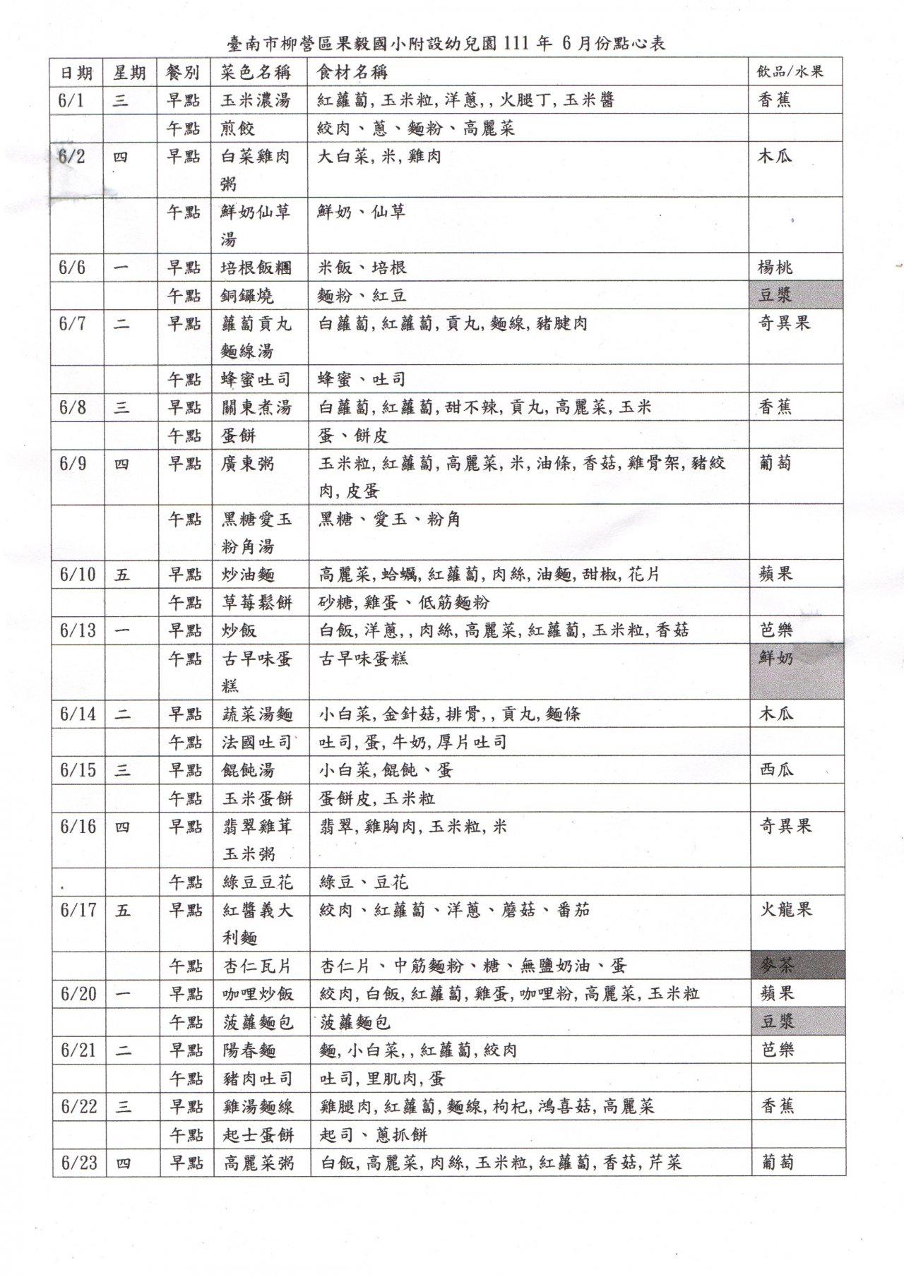110 學年度第二學期 6 月份點心表,如附件