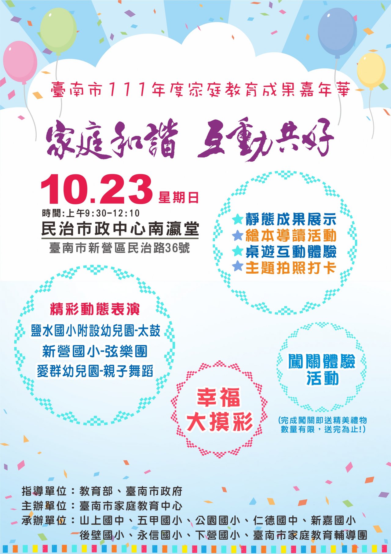 一、目的:為展現 111 年度本市家庭教育辦理成果,促進各校經驗交流,特辦理本嘉年華活動。