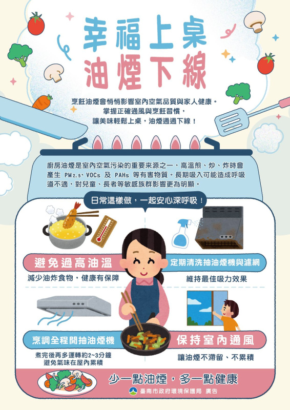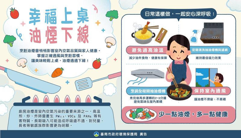 幸福上桌,油煙下線!廚房高溫煎、炒、炸時產生之油煙是室內空氣污染物質來源之一,長期吸入可能造成呼吸道不適;臺南市環保局提醒市民朋友,烹飪請開抽油煙機並保持室內通風,減少油煙,守護居家空氣品質與家人健康。