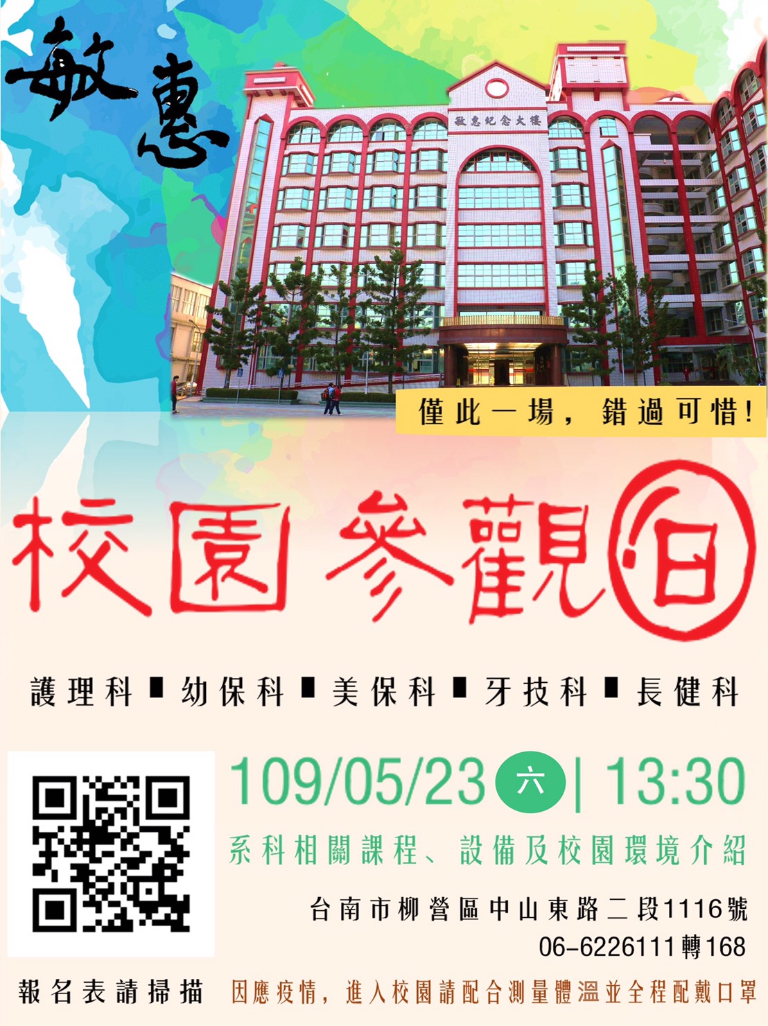 說明: 一、本校為醫護類學校,設有護理、牙體技術(齒模)、美容保健、幼兒保育科與「長期照顧與健康促進管理科」,均男女兼收。 二、為提供 國三學生及家長完整多元之升學資訊,訂於 109 年 5 月 23 日下午 13:30 辦理參觀活動,欲參加者請連結網址 https://reurl.cc/rx5klO 報名。 三、若有相關問題請洽本校教務處招生中心助理張珈禎,電話 06-6226111 轉 168 四、惠請 公告周知。