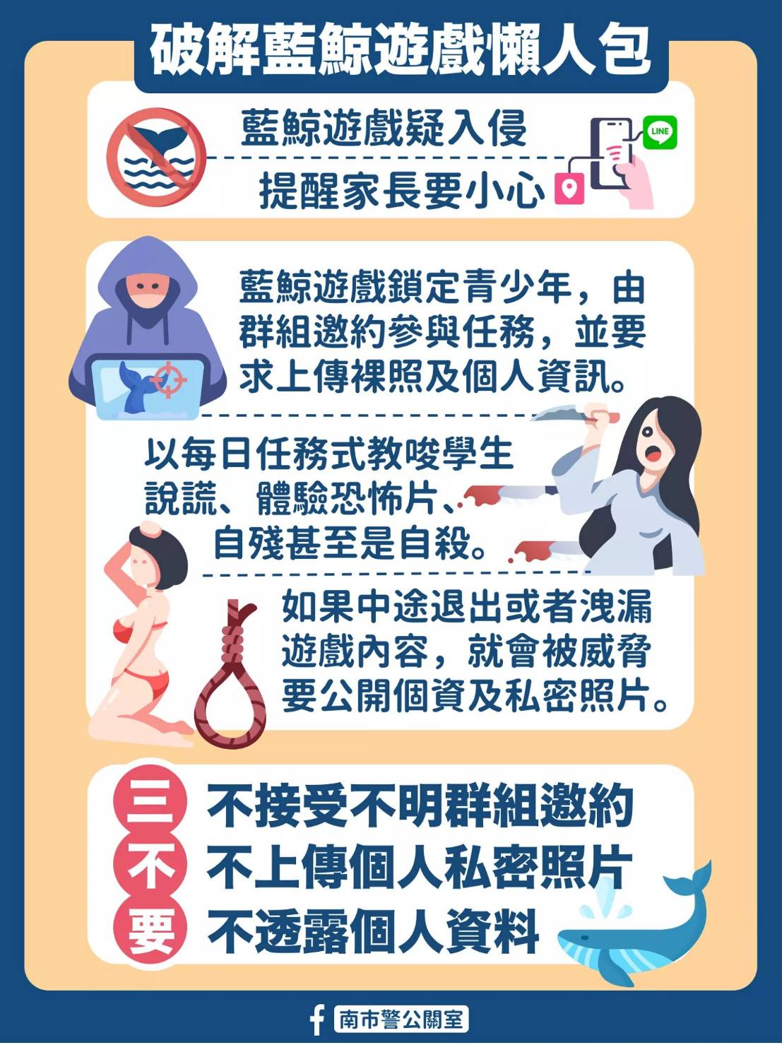 四、併附臺南市政府警察局製作「破解藍鯨遊戲懶人包」圖卡 1 份,請各校廣為宣導。