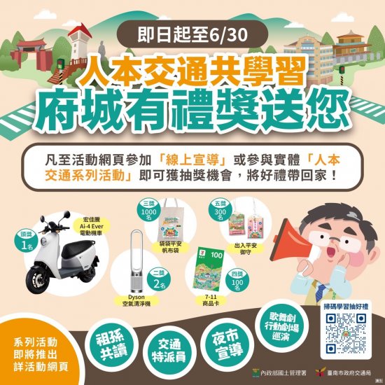 二、旨揭系列宣導活動已於 3 月 31 日正式起跑,並同步推出「人本交通共學習 府城有禮獎送您」抽獎活動,線上學習抽獎活動期程為即日起至 6 月 30 日止。