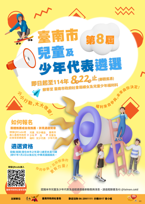 (四)詳細訊息、遴選簡章、海報電子檔及兒少代表介紹,請參閱本局官網(網站縮址: http://pse.is/5a5he2 ;路徑:臺南市政府社會局首頁/兒童少年福利/兒少權益及兒少代表/臺南市兒童及少年代表)