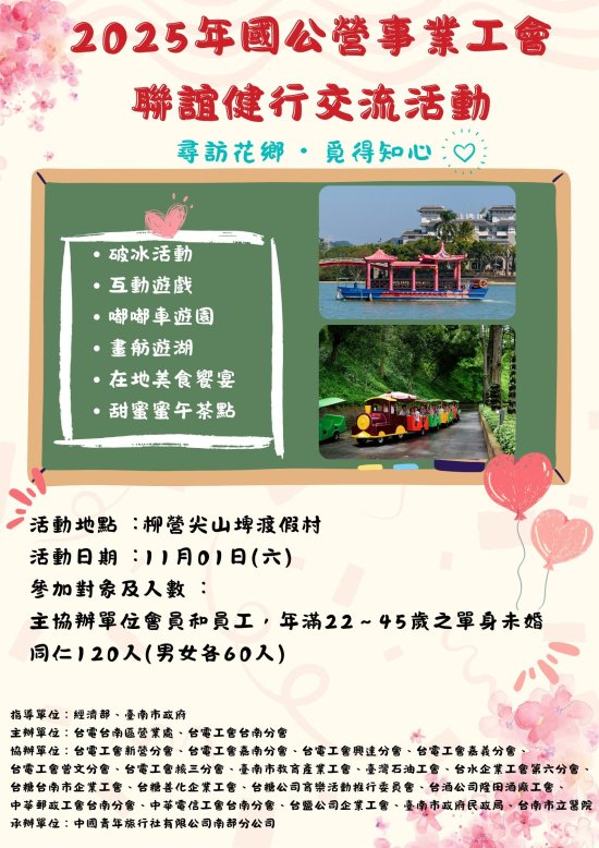 二、檢附「2025 年國公營事業工會聯誼健行交流活動 DM」及「活動行程」各 1 份供參。