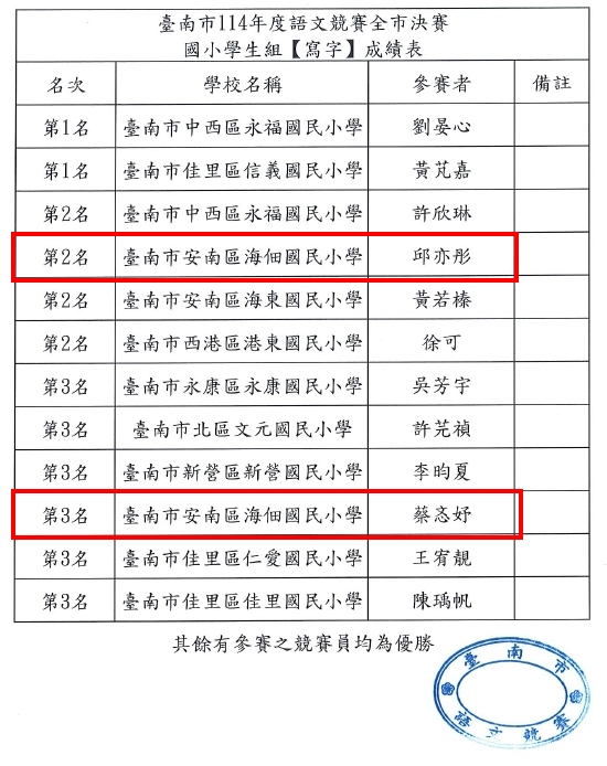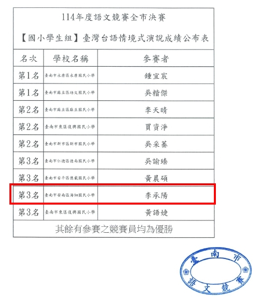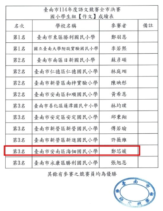 本校學生參加臺南市 114 年度語文競賽全市決賽,榮獲佳績