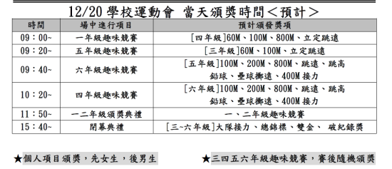 另外,下午大隊接力時間有調整,請留意各學年比賽的時間,請參閱(表三)