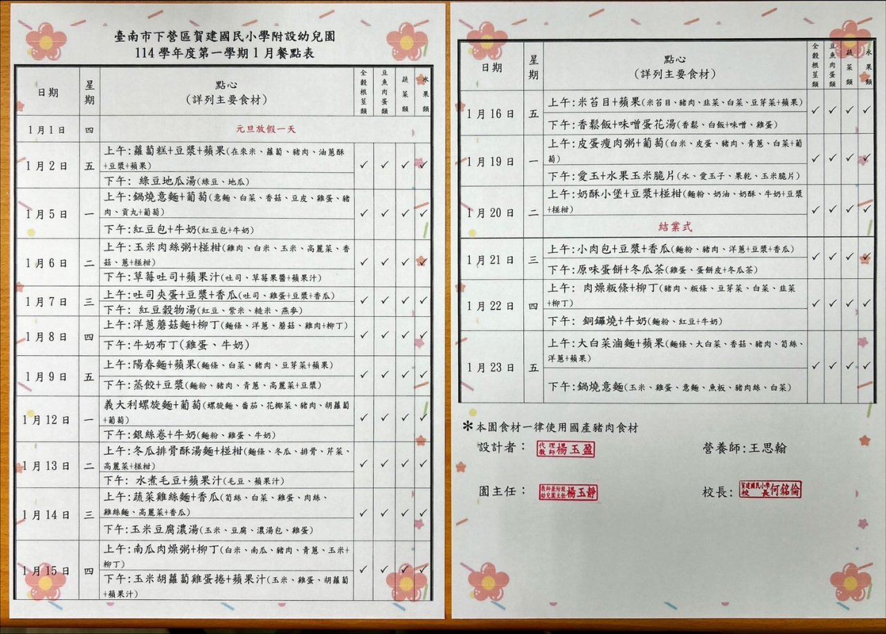賀建國小附幼 115 年 1月點心食材表及午餐食材表