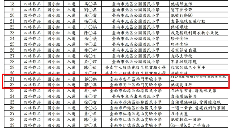 賀! 郭禹樂、郭千萭 同學 參加臺南市114年度「淨零綠生活 友善地球」學生網路競賽 入選