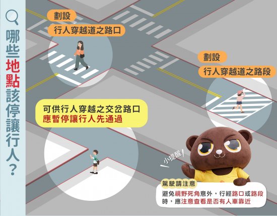 二、有關道路交通安全規則第 103 條規定,汽車行近未劃設行人穿越道之交岔路口,遇有行人穿越道路時,均應暫停讓行人先行通過。另依道路交通管理處罰條例第 44 條第 2 項規定,駕駛汽車行近行人穿越道或其他依法可供行人穿越之交岔路口,有行人穿越時,不暫停讓行人先行通過者,處新臺幣一千二百元以上六千元以下罰鍰。