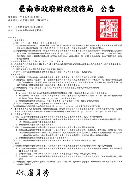 開徵本市112年地價稅公告1份,張貼本校公布欄協助宣導周知