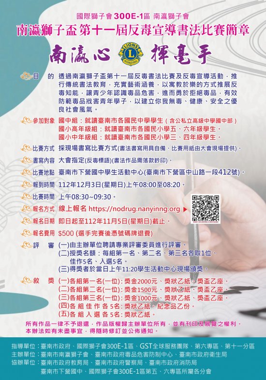 一、為推行傳統書法教育,充實學生藝術涵養,以寓教於樂的方式推展反毒知能,讓青少年認識毒品危害,進而勇於拒絕毒品,本局特與臺南市南瀛獅子會合作辦理旨揭比賽。