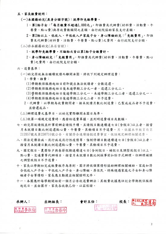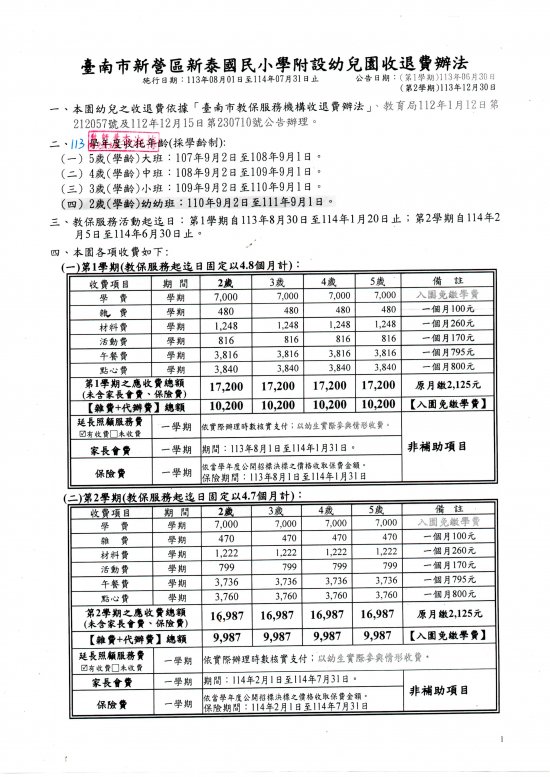 依據幼兒教育及照顧法第 38 條規定:教保服務機構之收退費基準、收費項目及數額、減免收費規定,應至少於每學期開始前一個月公告之。本校附幼依規定,預定於 2024 年 6 月 30 日前公告本校附幼收退費辦法,詳見附件:收退費標準核章版-臺南市新營區新泰國民小學附設幼兒園 113 學年度上學期收退費辦法。