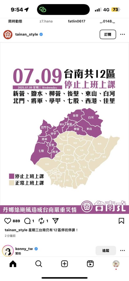 因受丹娜絲颱風影響,本市部分地區電力中斷尚未修復,供應中斷或供應困難,臺南市政府根據「天然災害停止上班上課作業辦法」第 4 條第 3 款規定宣布新營、鹽水、柳營、後壁、東山、白河、北門、將軍、學甲、七股、西港、佳里等 12 區明(9)日停止上班、停止上課。