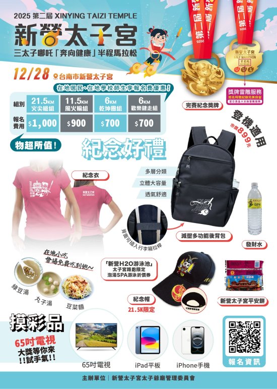 六、報名網址: https:// lohasnet.tw/TaizikunRun2025/ 其他未盡事宜請洽新營太子宮廟: 06-6504038/黃燕美秘書 0975-013936 或新興國小張菁峰校長 0975-718359 。