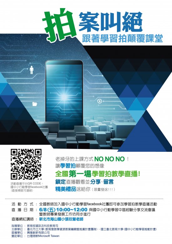 一、旨揭活動由教育部 107 年教育雲教學資源教案編輯暨推廣計畫團隊主辦,邀請優秀教師運用學習拍進行教學直播活動。 二、第一場次由新北市海山國小張玟慧老師預計 107 年 6 月 8 日上午 10 時至 12 時於 FaceBook 社團進行直播,參加方式請詳閱附件活動海報。 三、檢附活動海報 1 份。