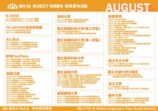 二、檢附「南科 AI_ROBOT 自造基地」8 月活動 DM 及官方網站 airobot-stsp.tw 、 Facebook 社團、 Line 社團加入連結(附件一、二),敬請協助宣傳。
