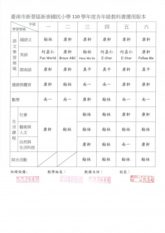 臺南市新營區新泰國民小學110學年度各年級教科書選用版本