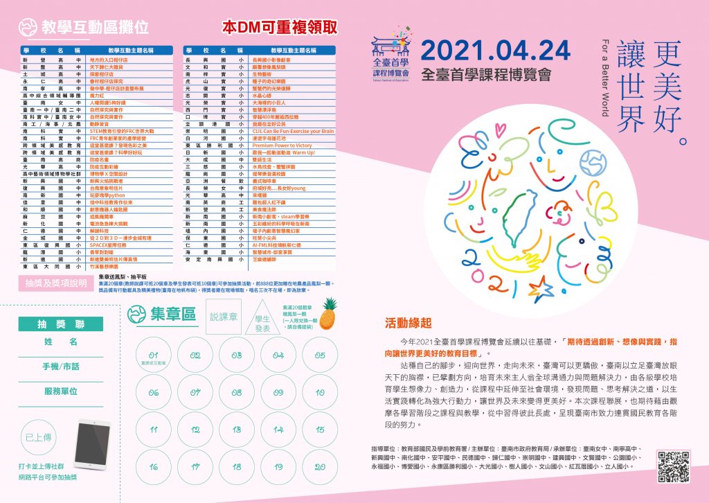 二、 新課綱上路已邁向第三年,本市所轄各級學校發展落實之 校本課程、亮點教師素養導向教學、學生學習均有精彩之 成果,本次課程聯展延續以往成果,「透過創新、想像與 實踐,指向讓世界更美好的教育目標」。期待藉由觀摩各 教育階段之課程與教學,讓教師從中交流學習並能為彼此 與學生加油鼓勵,呈現臺南市致力連貫國民教育各階段的 努力。