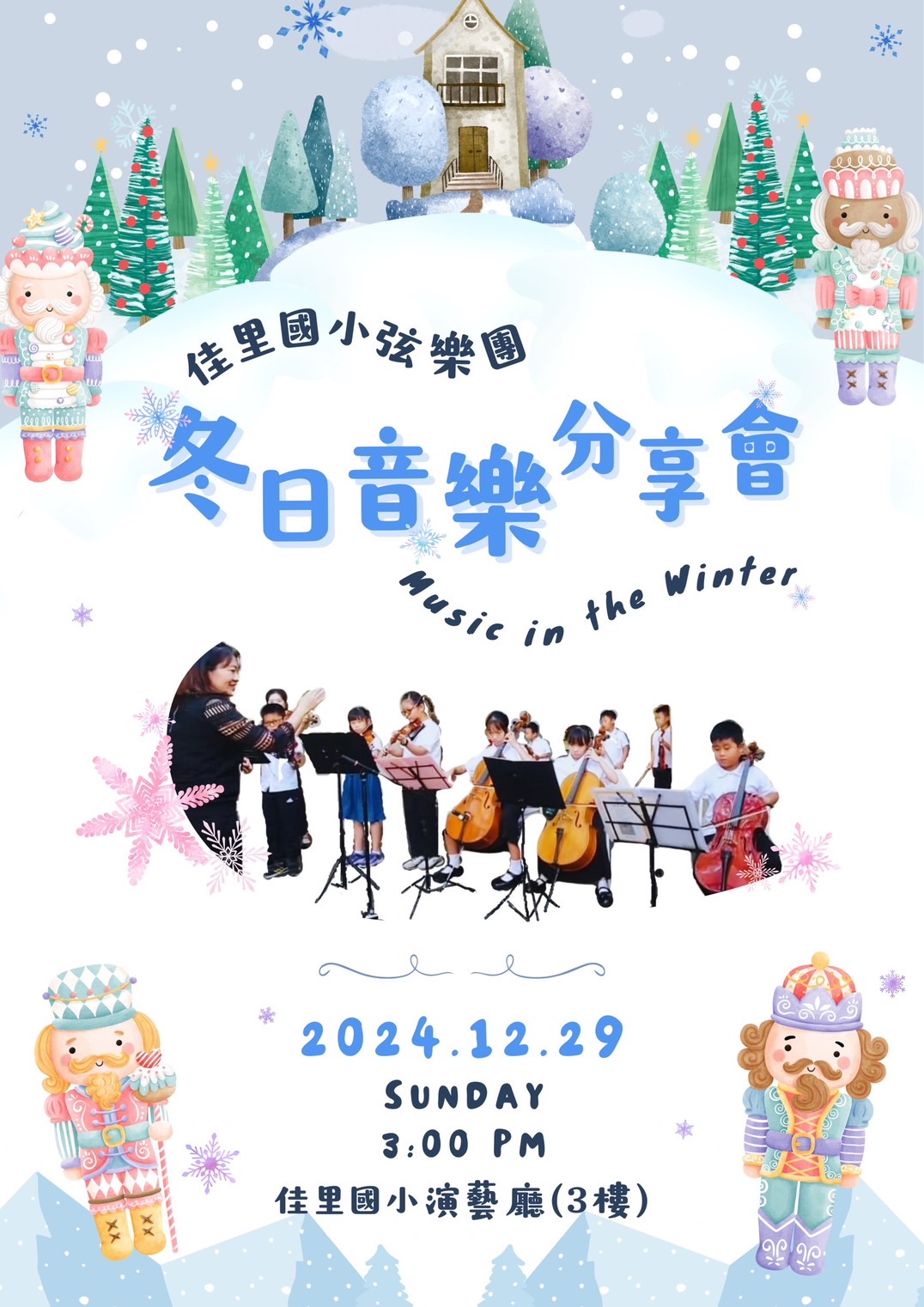 午後三點,輕柔的弦音拉開了序幕。一曲二人合奏,默契十足,宛如一場靈魂的對話;接著是獨奏環節,每位小朋友都展現了自己的音樂才華,或悠揚或深情,令人陶醉其中。而壓軸的大合奏更是讓人屏息,九把弦樂器在楊倩寧老師的指揮下,奏響了團結與夢想的樂章。樂音飄揚,彷彿帶領觀眾進入了一片溫暖的冬日森林。