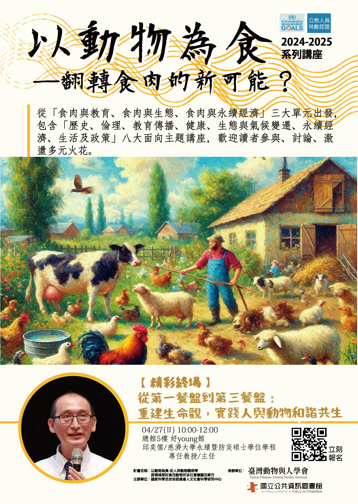 一、旨揭活動由國立公共資訊圖書館與「臺灣動物與人學會」合辦,自 113 年 8 月起至 114 年 6 月止,就「以動物為食」主題邀請相關領域專家與教育者,與讀者共同參與、討論、激盪多元火花,為自己、家人及大眾未來可能遭遇的生活問題預想因應;系列講座主題包括 SDGs 、食農、科普等相關內容,採實體講座及線上同步直播方式進行,並搭配線上及實體書展,每場介紹相關書籍。