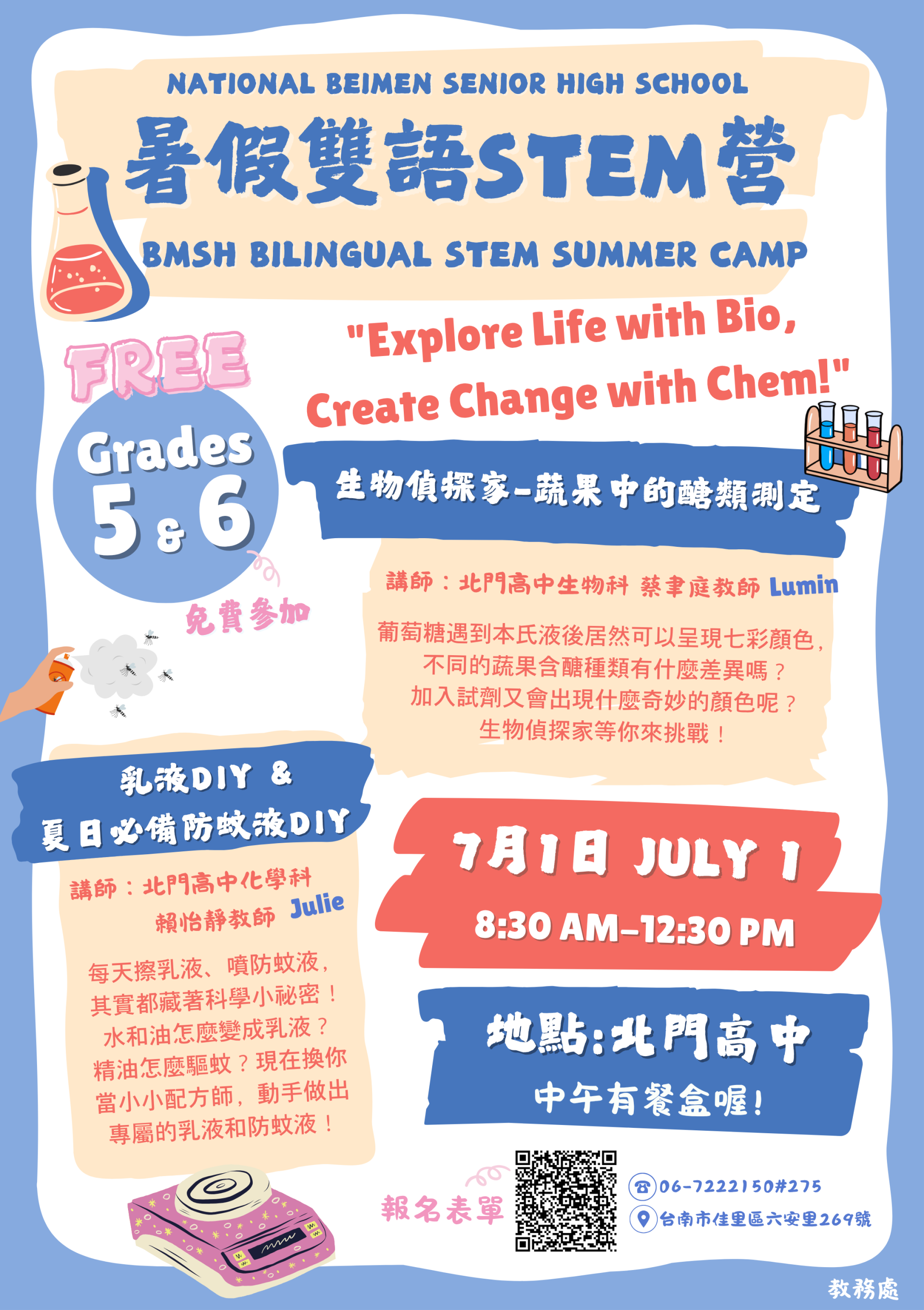 一、為提升大北門地區學生之自然科學探究能力與英語應用素養,本校特於暑假期間辦理「暑假雙語 STEM 營 BMSH Bilingual STEM Summer Camp」。