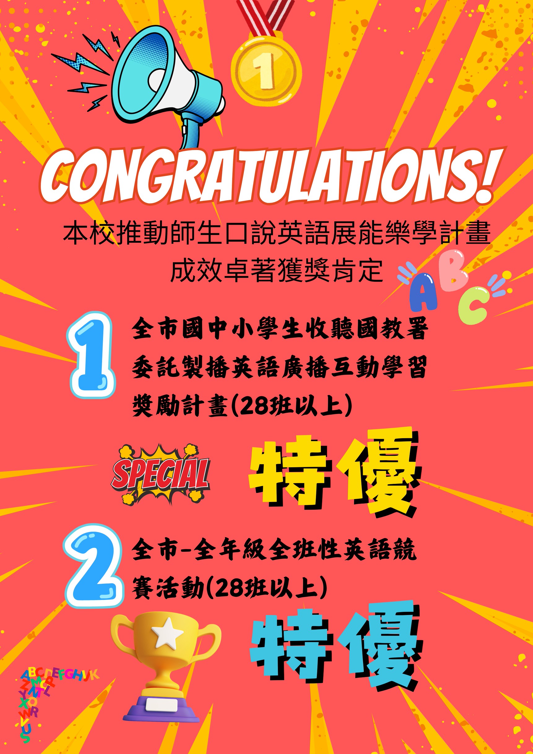 本校榮獲全市特優 全年級全班性英語競賽活動 全市國中小學生收聽國教署委託製播英語廣播互動學習獎勵計畫
