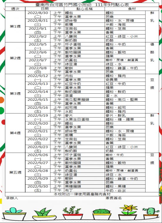 竹門附幼111學年度第一學期8、9月點心表
