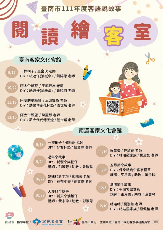 一、旨揭活動係以客語為主,華語為輔方式說故事,還有 DIY 手作課程,適合大小朋友共同參與,請貴校協助於網站公告及宣傳,詳細課程資訊可參閱活動海報或至本府客家事務委員會官網 https://reurl.cc/QbVdnq 查詢。 二、活動詳情請參閱附件海報電子檔