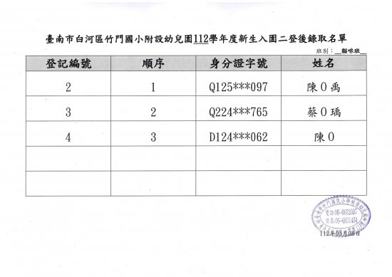 竹門附幼112學年度新生入園第二次招生登記後錄取名單