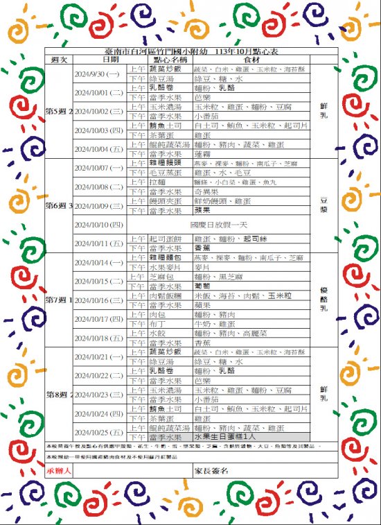 竹門附幼113學年度第一學期10月點心表