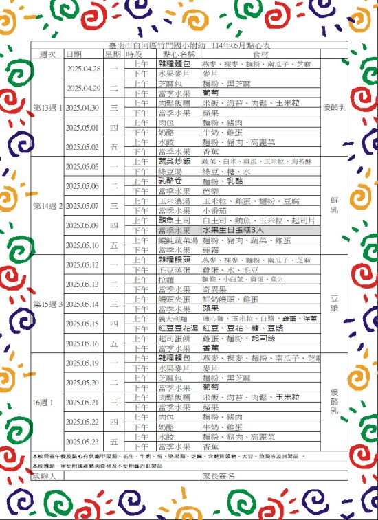 竹門附幼113學年度第二學期5月點心表