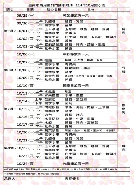 竹門附幼114學年度第一學期10月點心表