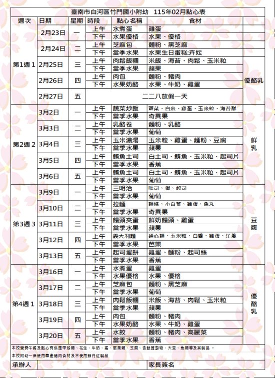 竹門附幼114學年度第一學期2月點心表