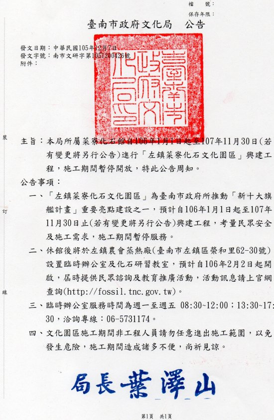 「左鎮菜寮化石文化園區」興建工程,施工期間暫停開放。