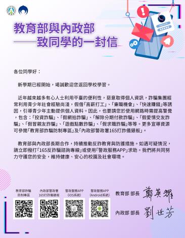 轉知 詐騙防制宣導「教育部與內政部致家長的一封信」,如附件。