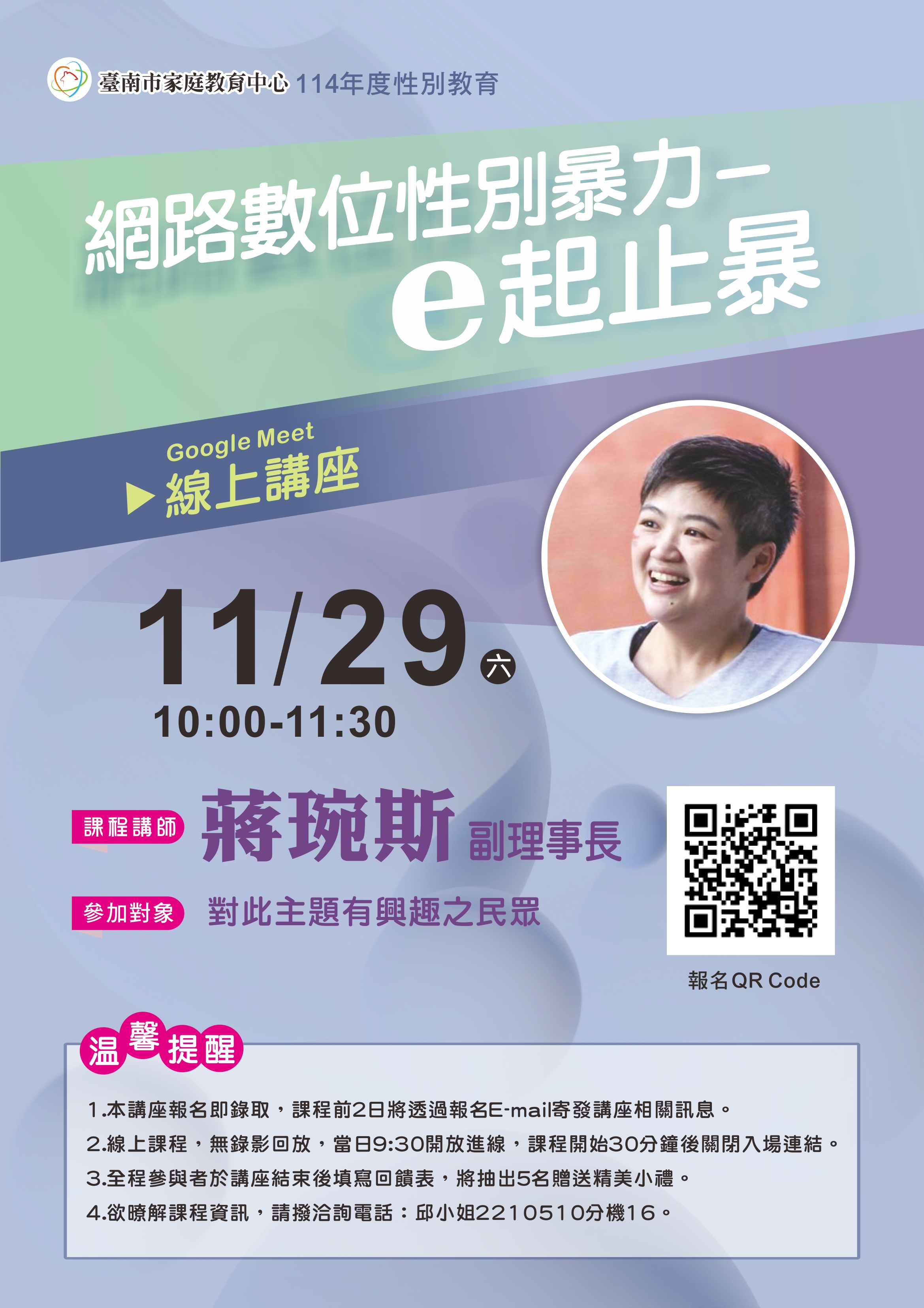 2025-11-18 轉知 臺南市家庭教育中心辦理「網路數位性別暴力-e起止暴」Google Meet 線上講座,歡迎踴躍參加。