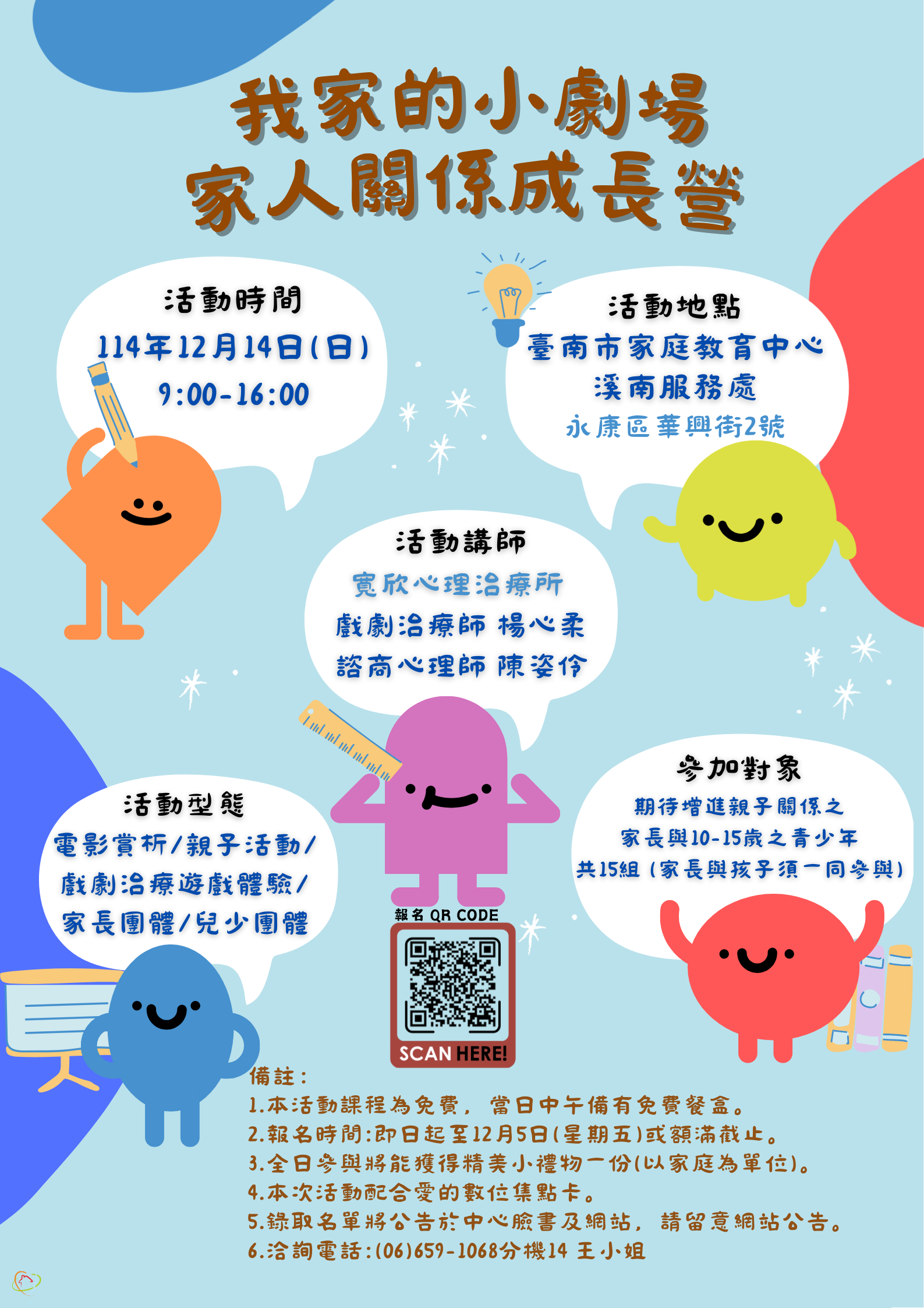 2025-12-02 轉知 本市家庭教育中心辦理114年「我家的小劇場-家人關係成長營」,鼓勵所屬家長及學生踴躍參與